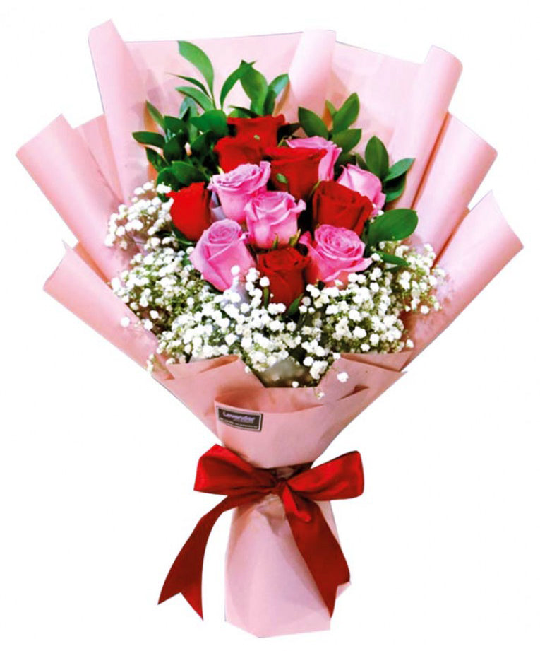 A fresh hand bouquet of 12 stalks red and pink roses accompanied by baby breath. A bouquet that will show all your love and devotion for the one you truly keep close to your heart.