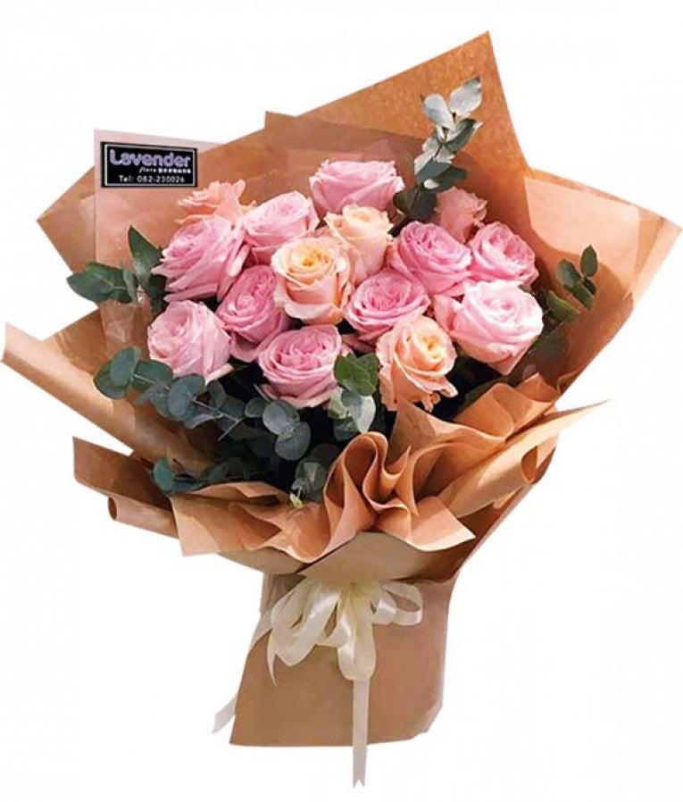 A fresh hand bouquet of 15 stalks pink and champagne roses accompanied by eucalyptus. A gorgeous petite handbouquet is the perfect little surprise to put a smile on their face!