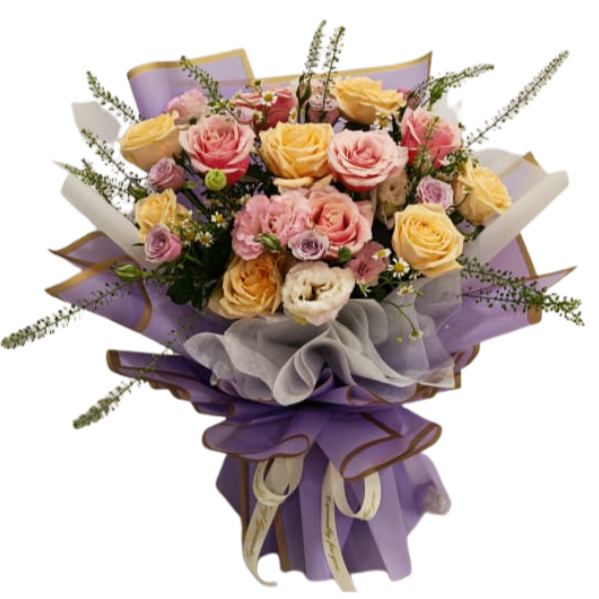 A fresh hand bouquet of 7 Champagne Import roses +  5 Pink Import roses accompanied by  with fillers. Perfect to express your appreciation any day!