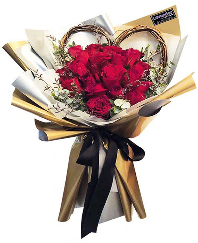 A fresh hand bouquet of 18 stalks red roses accompanied with fillers. A bouquet that to represent your love for your loved one. Nothing whispers love more than a red rose.