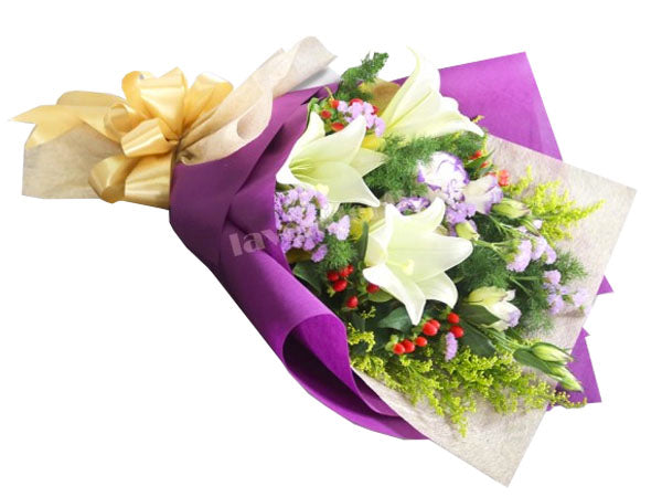 A fresh hand bouquet of 3 Madonna lilies and eustoma accompanied with some fillers. It is important to remind her that she is one of a kind; she is strong but lovely and tender at the same time.
