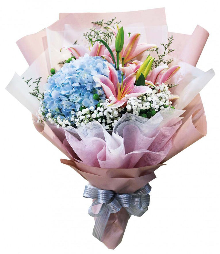A hand bouquet of 1 blue Hydragea, 2 Stargazers with some fillers. This bouquet a great representation of your love and affection towards your beloved ones.