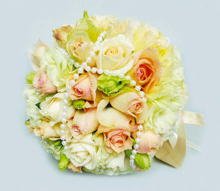Bridal Bouquet of 12 stalks cream and champagne roses with white eustoma and decorating pearls