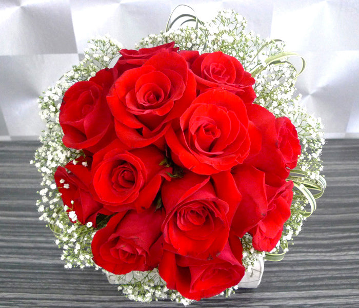 Bridal bouquet of 12 stalks red roses with baby's breath