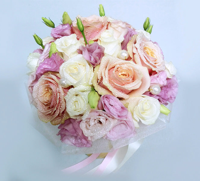 Bridal bouquet of 12 stalks peach and white roses with pink eustoma