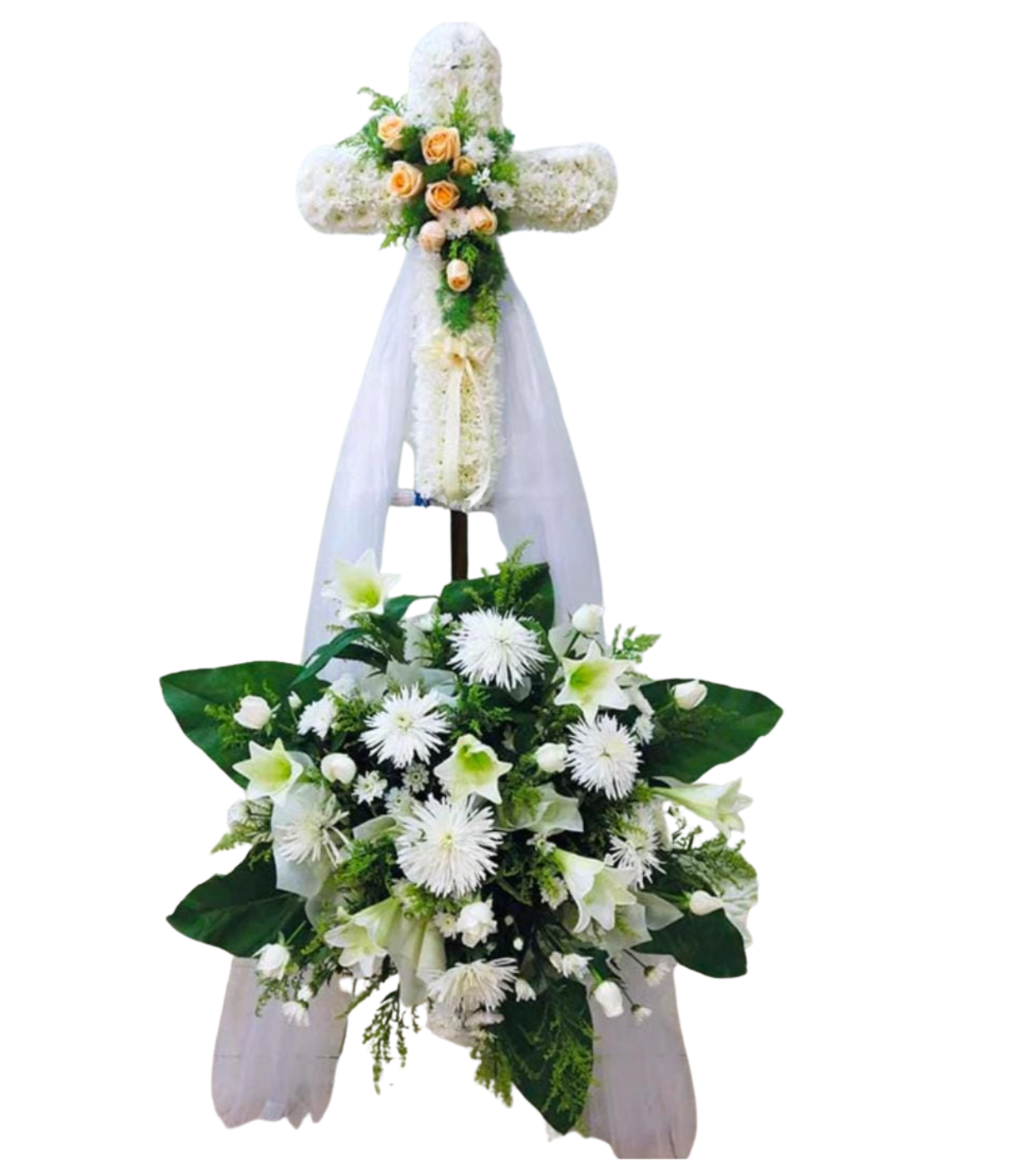 Two tier of cross wreath with fresh yellow chrysans, yellow roses and chrysans with some greenery.