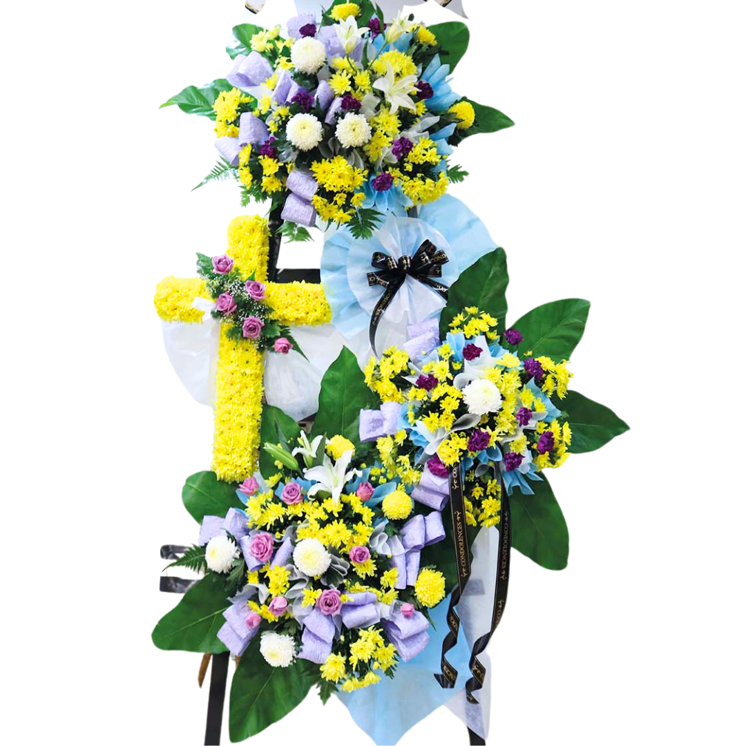 Four tier of cross wreath with fresh madonna lilies, big mum, roses and chrysans with some greenery.