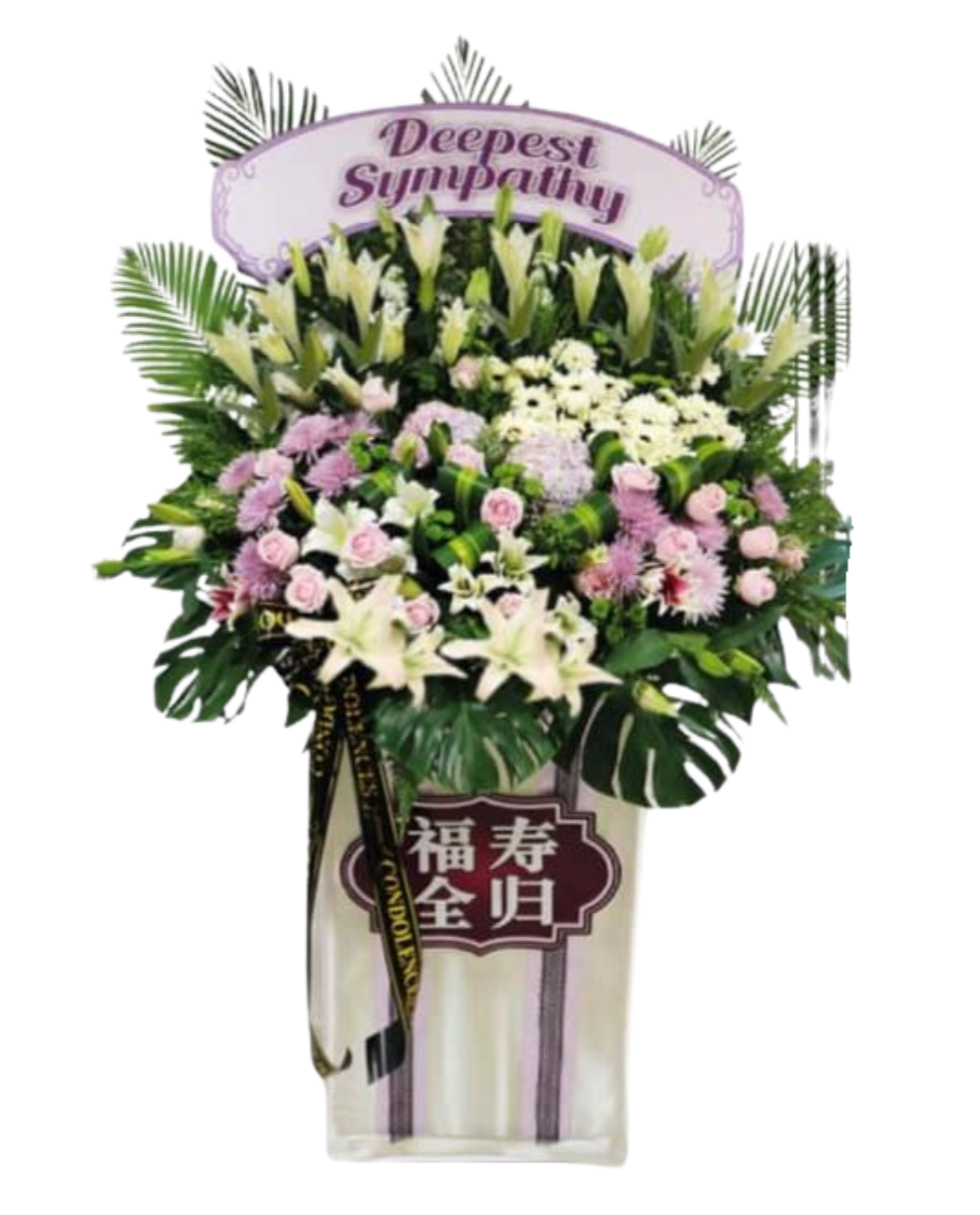 One tier of wreath with fresh madonna lilies, roses and hydrangea with some greenery.