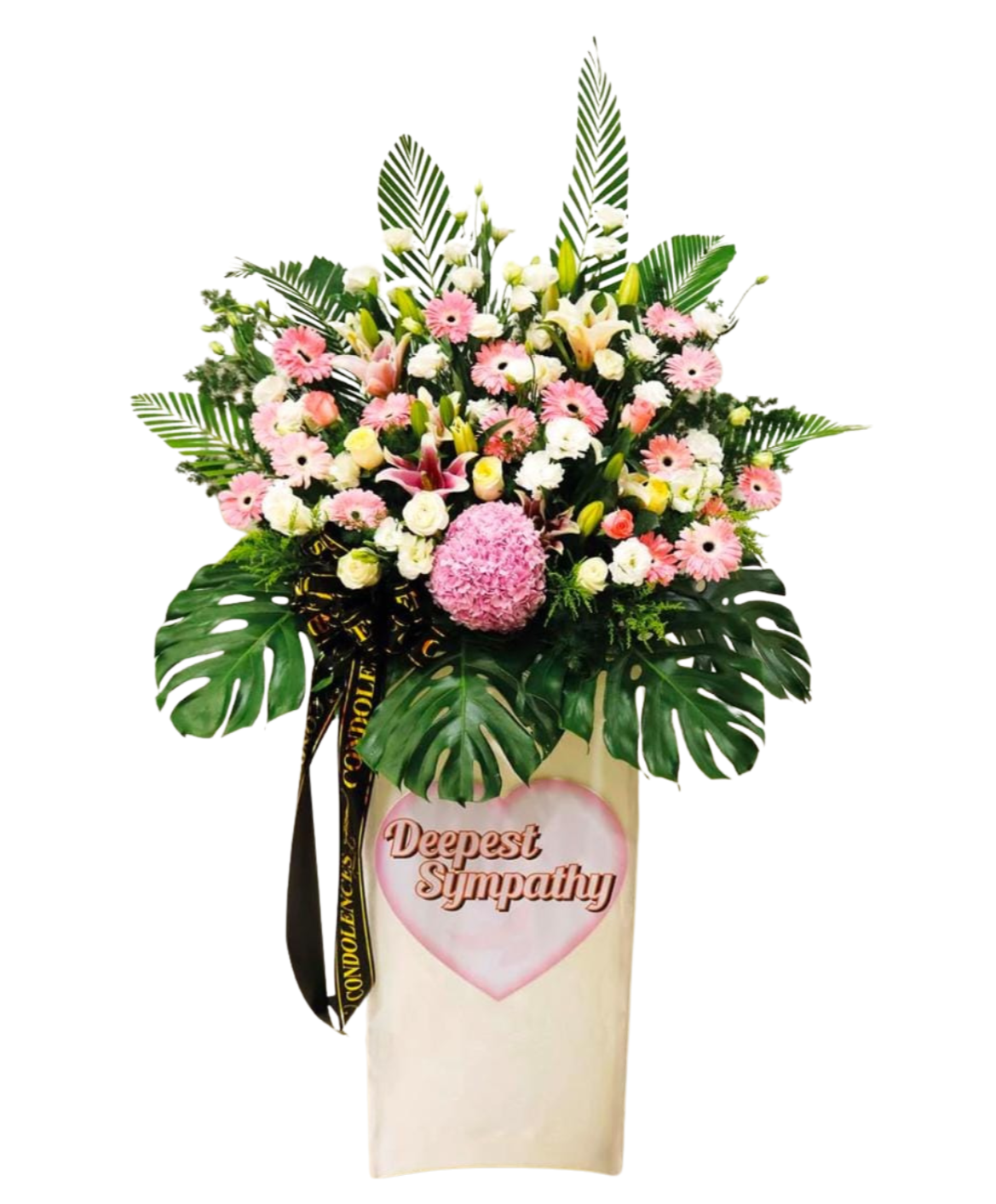 One tier of wreath with fresh madonna lilies, roses and hydrangea with some greenery.