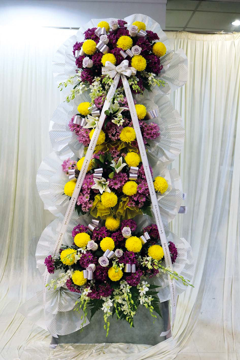 Four tier of cross wreath with fresh orchid, big mum, roses and chrysans with some greenery.