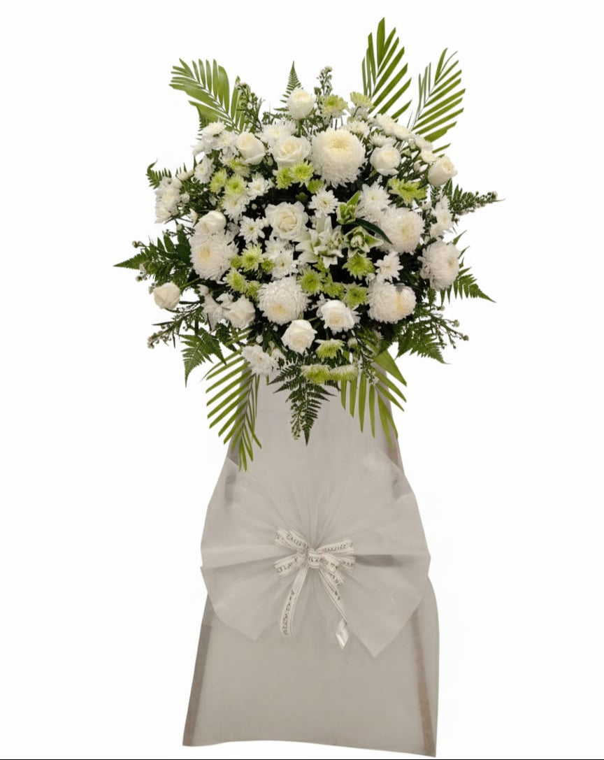 One tier of wreath with fresh with fresh casablanca lily, roses, big mum and chrysans with some greenery.