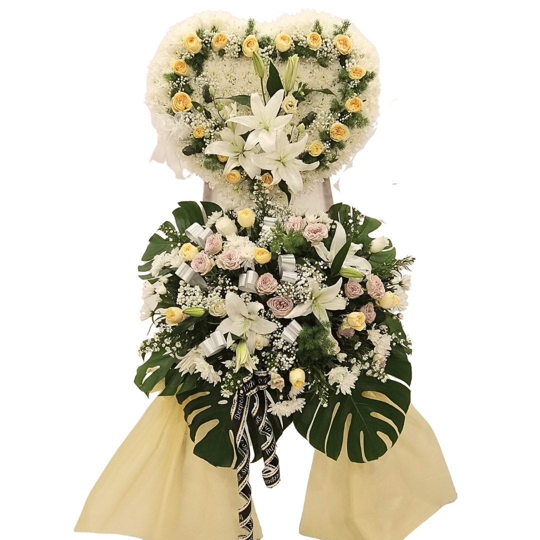 Wreath with fresh casablanca lily, roses and chrysans with some greenery.