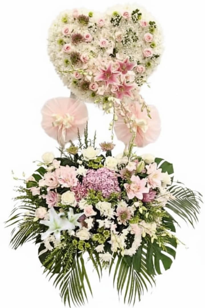 Wreath with fresh casablanca lilies, baby breath, big mum, hydrangea, roses and chrysans with some greenery.