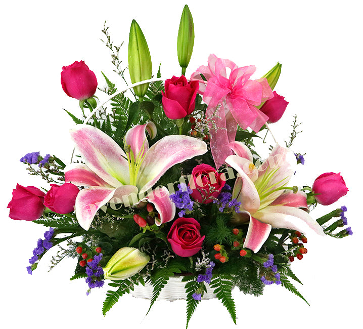 Fresh flower arrangement of shocking pink roses and stargazer lilies