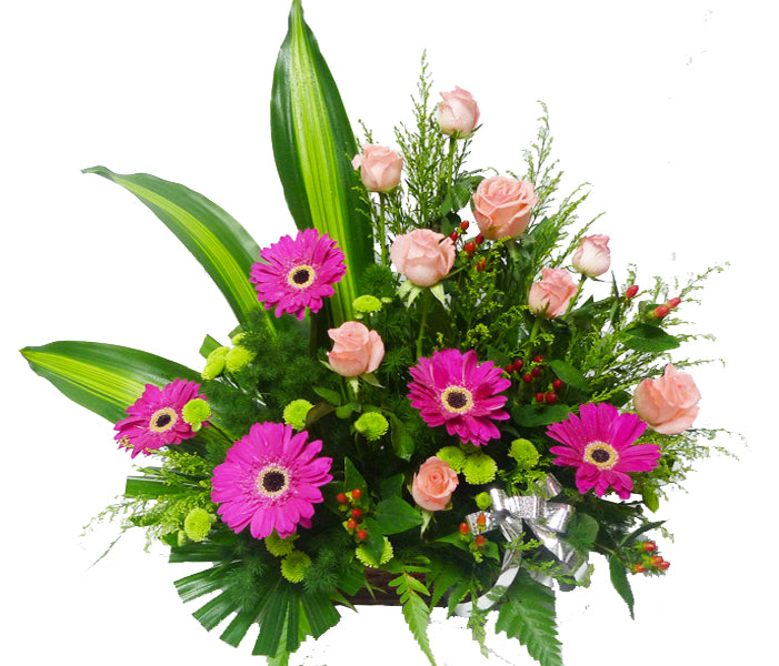 Fresh flower arrangement of shocking pink gerberas and pink roses with some greenery