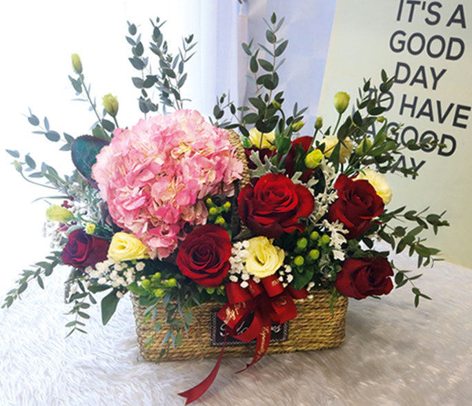 Fresh flower arrangement of roses, eustoma, Hydragea with some filler.