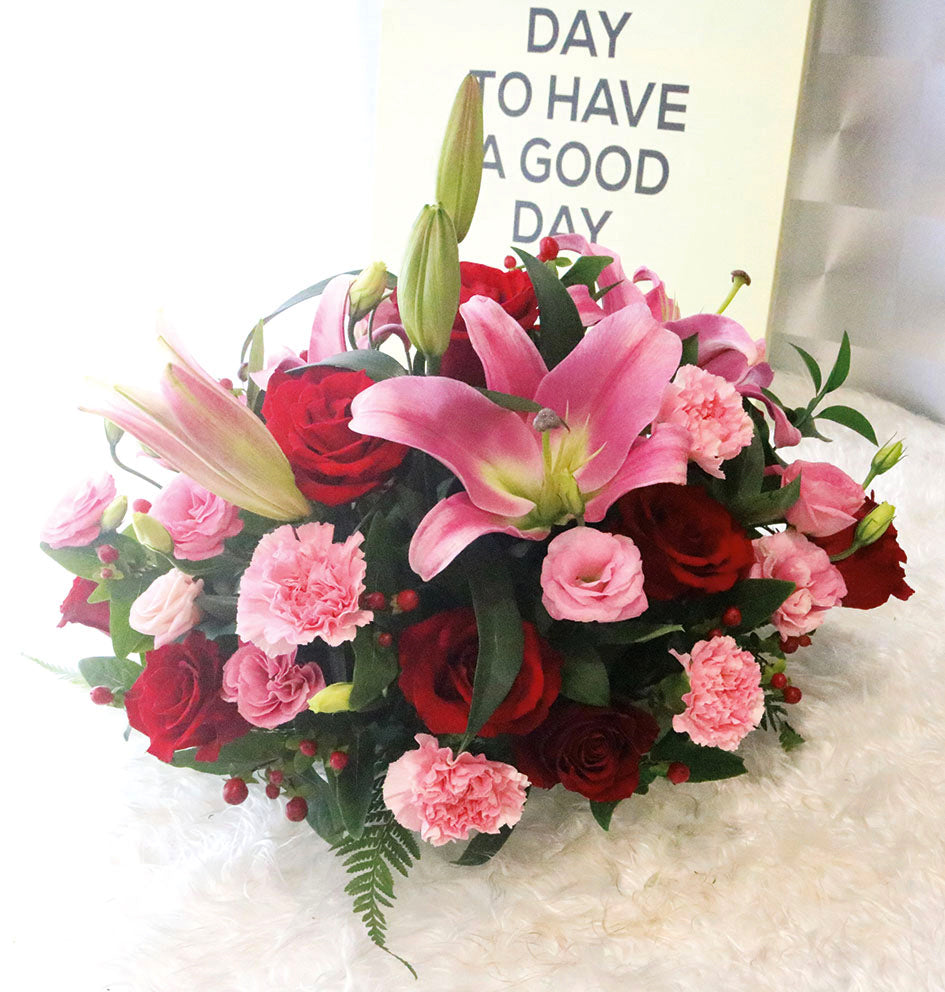 Fresh roses, carnation, stargazer lilies and eustoma arrangement