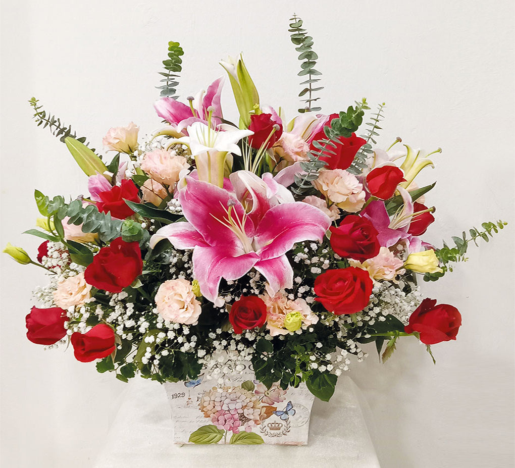 Fresh flower arrangement of red roses, eustoma and stargazer lilies with fillers.