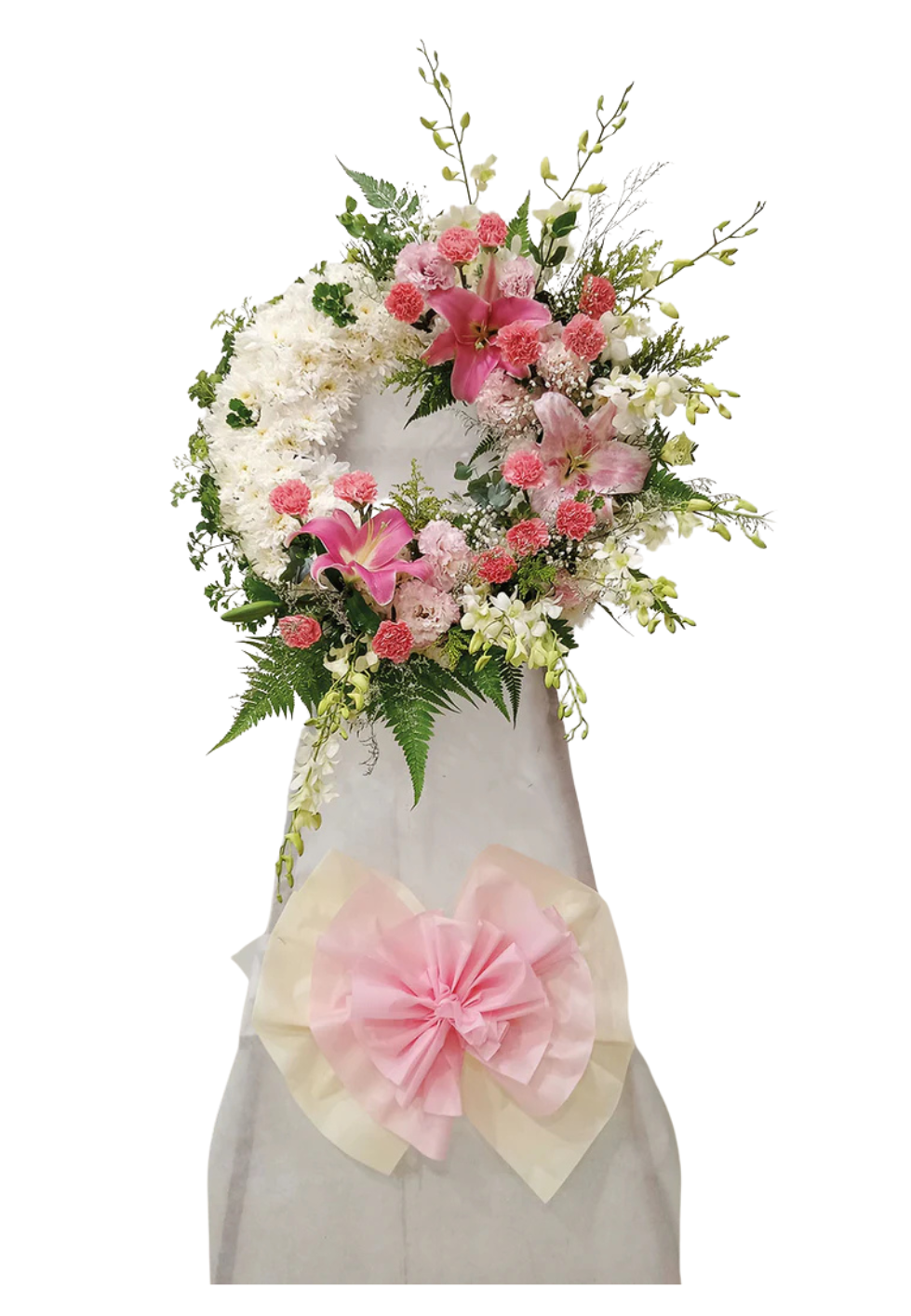 One tier wreath with fresh stargazer, carnations, orchid and white chrysans with some greenery.