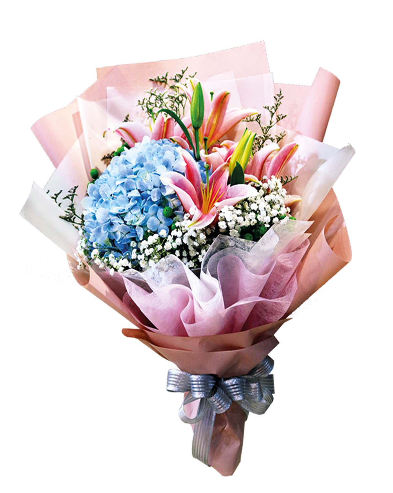 A bouquet of 2 stalks stargazers and 1 hydragea with some fillers