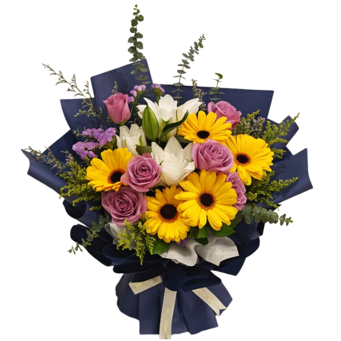 1 White Lily + 5 Yellow Daisy + 6 Purple Roses + Fillers