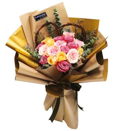 A fresh hand bouquet of 20 stalks mix colours roses accompanied with fillers. Perfect to express your appreciation any day!