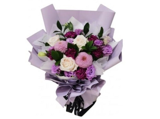 6 Purple Carnations + 3 White Roses + 2 Purple Ping Pong + Eustomas+ Leaves